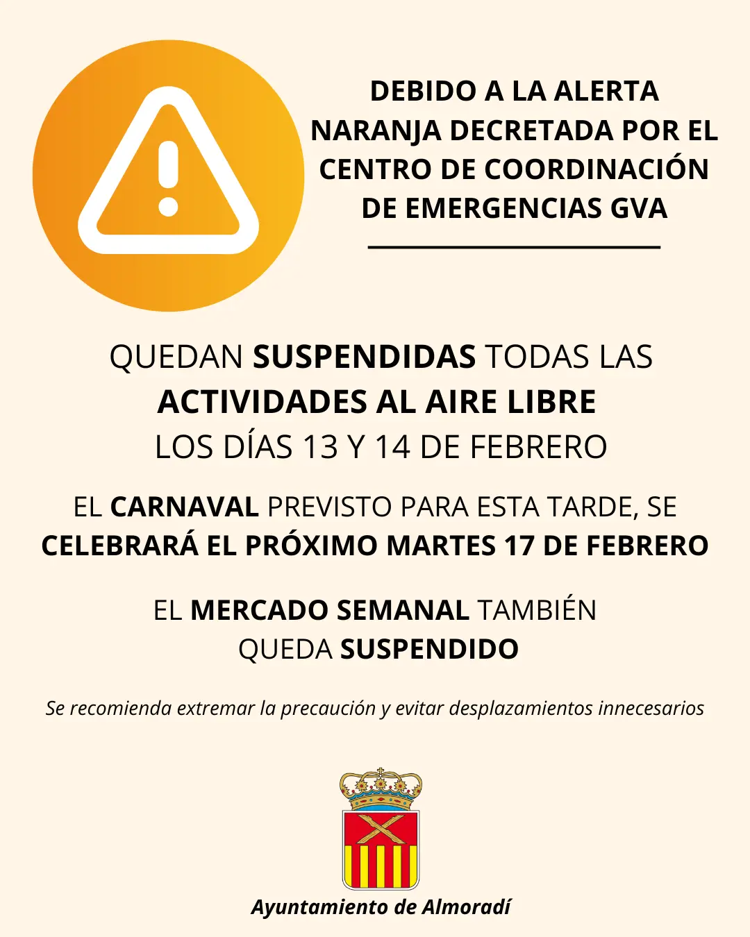 Debido a la alerta naranja decretada por el Centro de Coordinación de Emergencias de la Generalitat Valenciana (GVA), el Ayuntamiento de Almoradí informa de que quedan suspendidas todas las actividades al aire libre los días 13 y 14 de febrero.